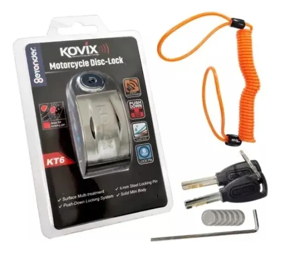 A Kovix KN1 é instalada diretamente no disco de freio da motocicleta, bloqueando a roda. Caso alguém tente movimentar a moto ou manipular a trava, o sensor interno detecta a vibração e aciona automaticamente o alarme, emitindo um som alto que ajuda a afastar possíveis tentativas de furto.